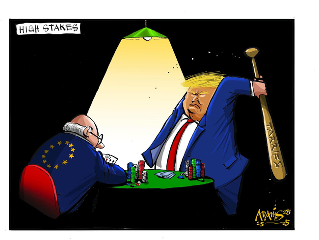 Adams shows Trump bullying the European Union instead of sitting down to play his cards fairly, and the more bluster and tariffs and threats and nonsense come from 1600 Pennsylvania Avenue, the fewer allies will be left to help cover for bad ideas.