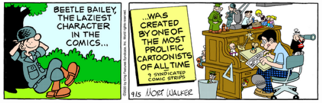 Skip to commentsWhile Charles M. Schulz’s Peanuts 75th Anniversary is getting the bulk of publicity this year, a month before that October 2nd, 1950 day is September 4th, 1950 – when Mort Walker’s Beetle Bailey debuted. And Beetle Bailey, unlike Peanuts, has been issuing new comic strips for all of its 75 years.
