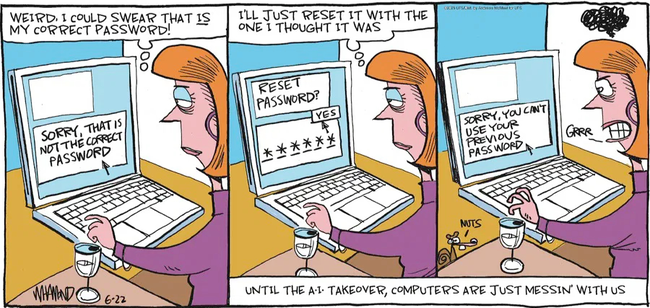 I also tried to subscribe to a site that wanted me to create a password before they’d take my money. Each password I tried was “invalid” but they never said why. I tried making it longer, I tried adding a “special character,” I added a capital letter, I made sure none of the numbers were consecutive.
