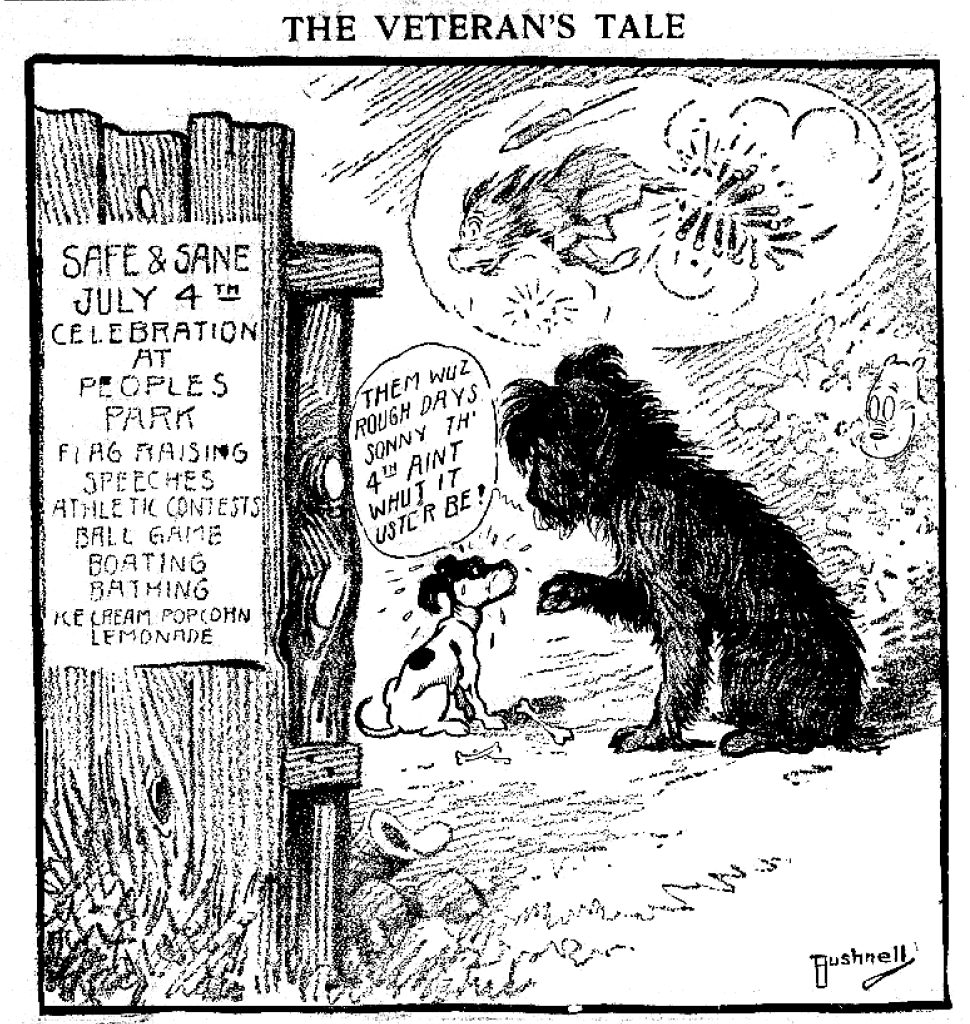 Thus was it ever. Bushnell’s 1914 cartoon was one of a number of entreaties for a “safe and sane” Fourth of July in which nobody got blowed up real good, including the dogs.