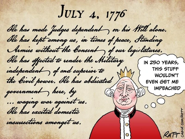 Ratt is not the only person to have pointed to the parallels between what our Founders rebelled against and what is currently happening in our country, and it does make you wonder if anyone will be listening at the various public gatherings today in which the Declaration will be read.