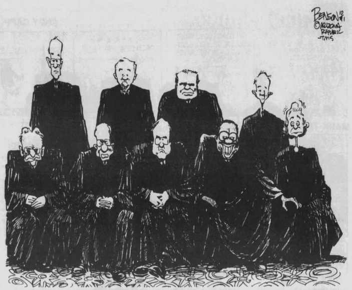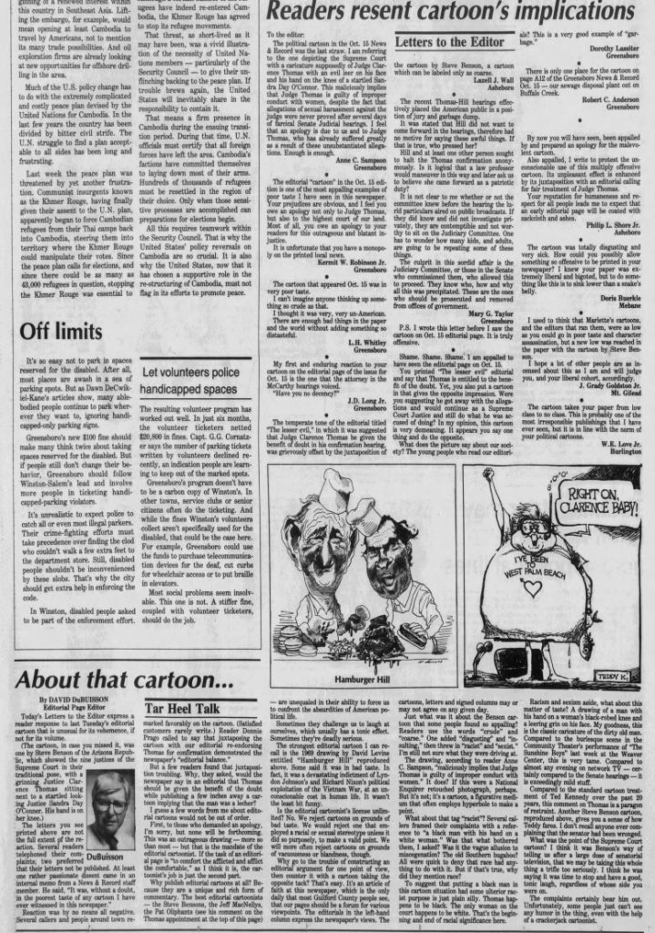 October 1991 Steve Benson cartoon that led to Greensboro News and Record Editorial Page Editor David DuBuisson having to defend the paper for running it and the cartoonist for creating it.