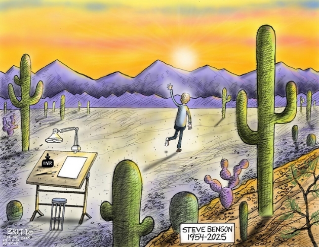 I had an opportunity to draw this tribute cartoon for Steve Benson. It ran in the Arizona Mirror this morning. Steve provided two cartoons a week to the mirror over the last 5-6 years. Steve was my mentor, but most importantly … he became one of my best friends. I loved him and I will miss him.