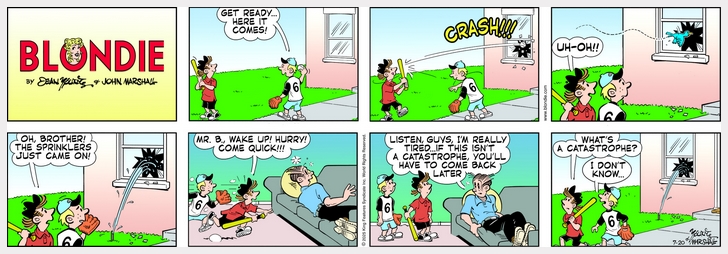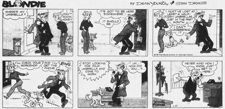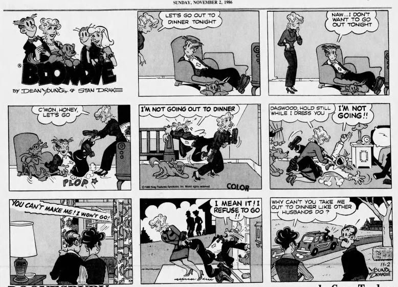This is a major change in the look of the Blondie Sunday strip since its change from a twelve panel (actually thirteen panel for the full half page) grid to a nine panel grid with the November 2, 1986 issue.