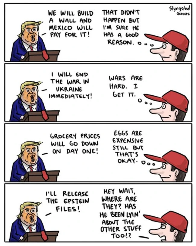 Both men in these cartoons begin to see through the Epstein deceptions, but Slyngstad’s uses that insight to question other articles of faith in Trump World.