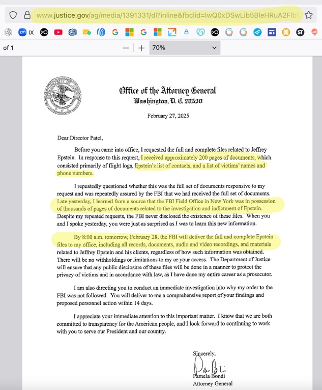 The problem isn’t getting any simpler, as it turns out Bondi was well aware of what critics have said, which is that the Epstein files are far larger than a folder on her desk, and, in this memo to Patel, she also confirms that she had “Epstein’s list of contacts.”