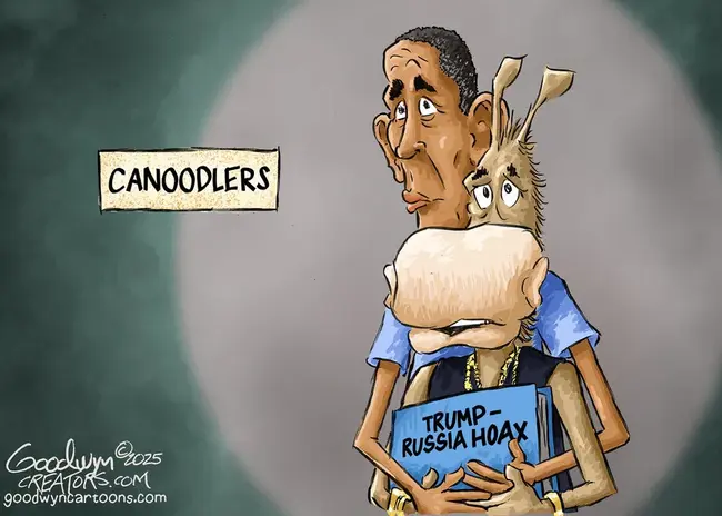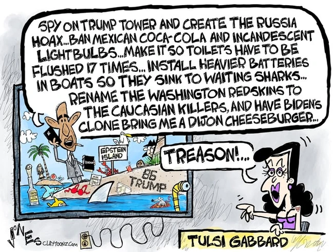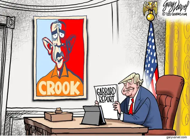 Varvel helps promote the administration’s plan to prosecute former leaders for disloyal thinking, and his vision of Tulsi Gabbard writing a report and Donald Trump sitting down to read it may be ridiculous, but the notion of rewriting history and conducting show trials is hardly funny.
