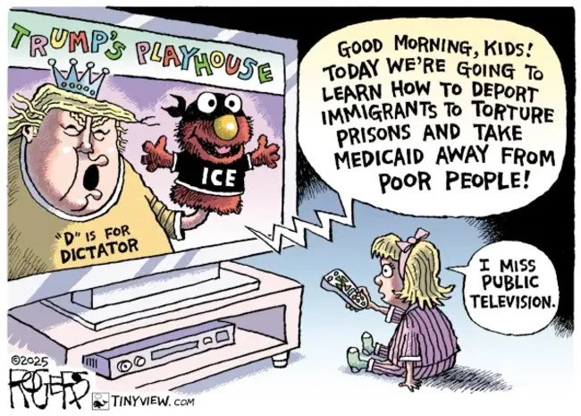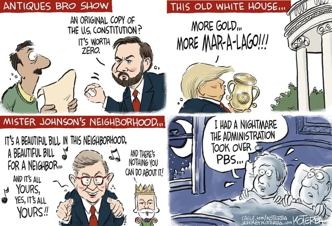Koterba and Rogers create parodies of what PBS might look like under Trump, but it’s possible that the Trump Reich may not stop with defunding public broadcasting. Project 2025 calls for the elimination of public broadcasting, and there are ways for the FCC to shut down NPR stations by rejecting their status as educational.