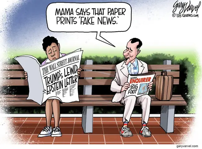 Varvel plays both sides of the net, given that he now shows Forrest Gump reading the Enquirer while disparaging the Wall Street Journal’s standards.