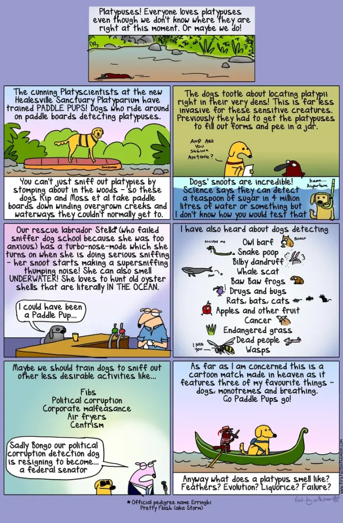 First Dog took a day off from politics to explain how sniffer dogs are being trained to detect platypi.