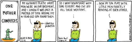 But Miles raises a different issue: With all the high-tech stimulation available, can kids still imagine simple toys as realistic? I’d suggest that the answer may be in how old Miles is by the time his dad tries to pass along his beloved army men, contrasted with the mother in RWO worrying that her four-year-old will come across his father’s collection.