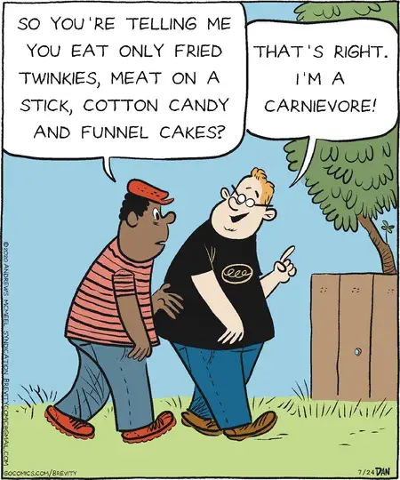 As for Carnievore food, it’s okay for a one-day visit, but when I used to sit a booth at the county fair each year, I learned to pack a lunch for the first six days and only eat fair food on the last one, because your body won’t tolerate that much fat, grease and sugar for very long.