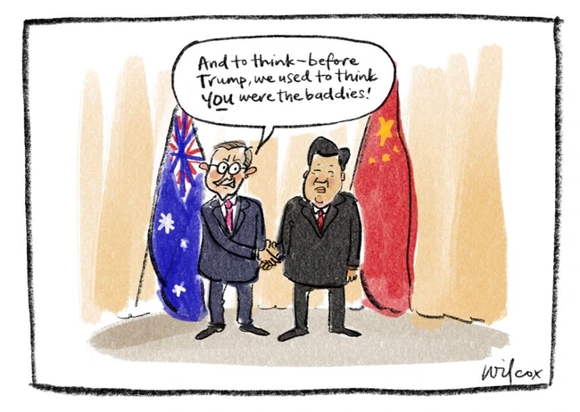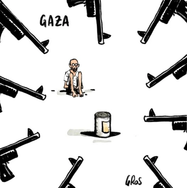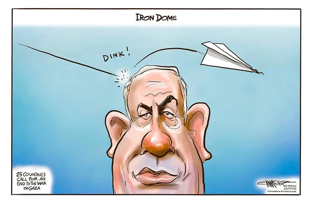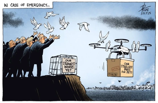 The whole world is watching, and, as Pope says, putting together their sternest words, but what they’re sending over is weaponry. As an Australian, he cites airplane parts. An American cartoonist could add more fearsome armaments, but either way, it surely offsets the thoughts and prayers that may go with it.