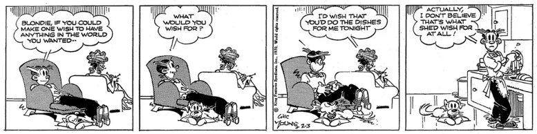 For as long as I can remember Blondie and Dagwood have sat in their living room in two chairs with Blondie’s back to Dagwood. Comics Kingdom’s archives only go back to 1970 – here’s a scene from that year: