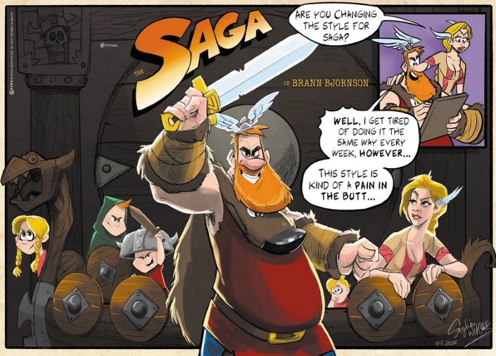Like Tom Armstrong Stephen Webster admitted to needing a change once in a while, though the style he chose for last Sunday’s The Saga Of Brann Bjornson probably won’t be seen again as he admitted in the strip.