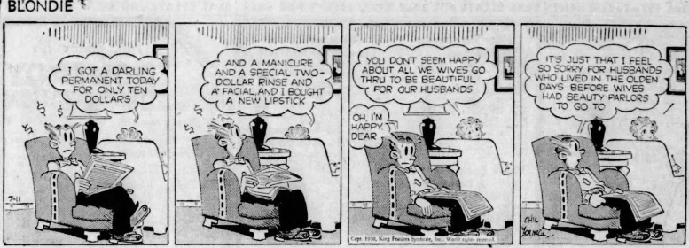 A one-off? An upstairs den? – they are after all in their bed clothes. But today we have Blondie and Cookie on that same couch. First a new title panel. Now a new sitting arrangement. What’s next? New hairstyles??!!