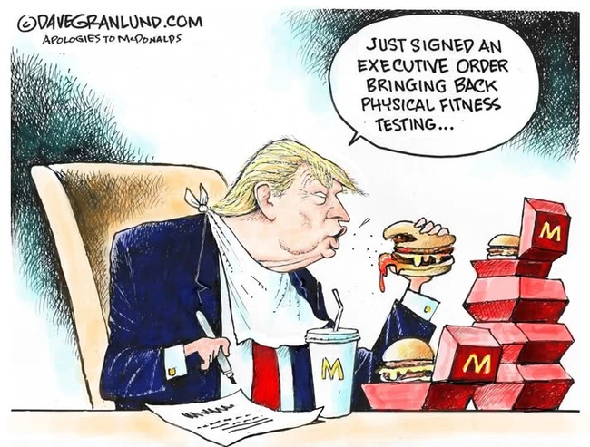 There is some comic relief in a few of Dear Leader’s attempts to change the subject from You Know Who, and re-instating the Presidential Fitness Test got giggles, given that Dear Leader lives on an insanely unhealthy diet, is morbidly obese despite lying about his dimensions and not only uses a golf cart but has been known to run it up onto the greens to avoid walking.