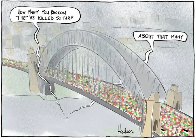 About 100,000 Aussies turned out in the rain to march over Sydney’s Harbour Bridge to show their opposition to the war in Gaza. And to answer the question in Hudson’s cartoon, that’s slightly more than the people who have been killed in Gaza so far.
