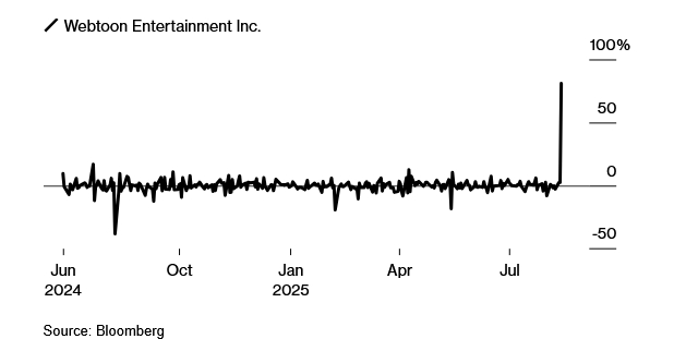 Webtoon Entertainment Inc. surged more than 97%, the biggest gain since its initial public offering last year, after announcing a partnership with Walt Disney Co. that will bring iconic characters such as Marvel’s Spider-Man and Luke Skywalker of Star Wars to its platform.