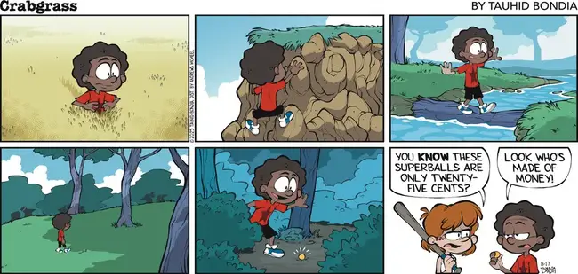 I’m a little unsure of the setting of Crabgrass. Superballs are still around, but they’re hard to find and they cost more than a quarter. I remember when they were a thing, though we didn’t bat them, since they went far enough without the extra help.