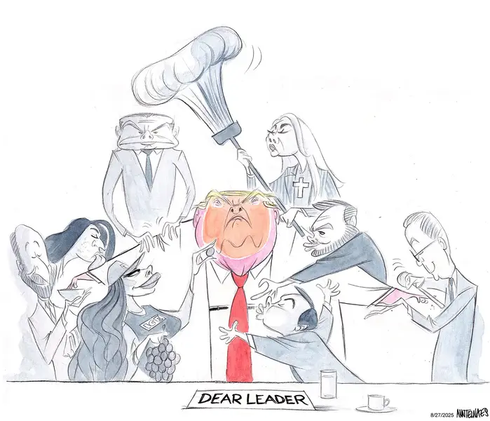 Telnaes does a good job of summing up a cabinet meeting in which people were hired at much greater cost to show much more sycophantic devotion to Dear Leader.