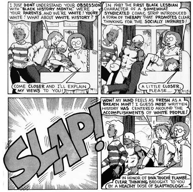 He graduated from college in 1979, and moved to Portland, Oregon, where he began working for alternative newspaper Willamette Week, eventually as associate art director. In 1983 he co-founded Just Out, Oregon’s first LGBT publication. In 1984, he created the lesbian African-American character Diva Touché Flambé and featured her with Brown Bomber in the strip “Cathartic Comics”.