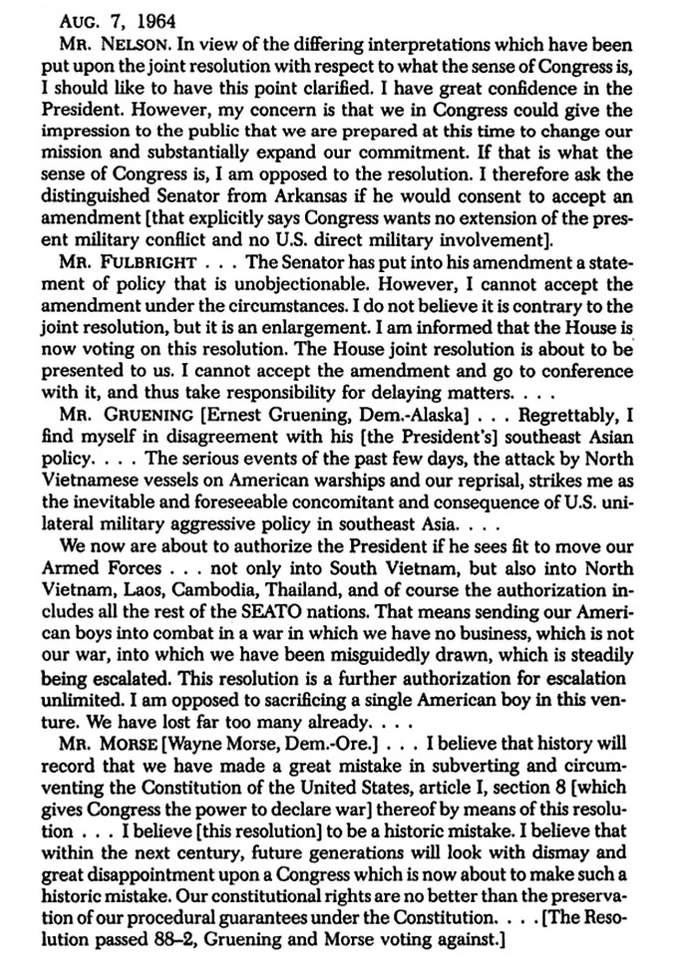 If you feel comparing this incident to the Gleiwitz Incident is over the top, consider, instead, the alleged attacks on the USS Maddox and Turner Joy in 1964, which was definitely absolutely positively not going to lead to a wider war, but simply to an appropriate, proportional response, which Congress approved.