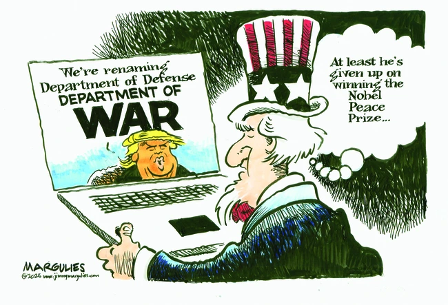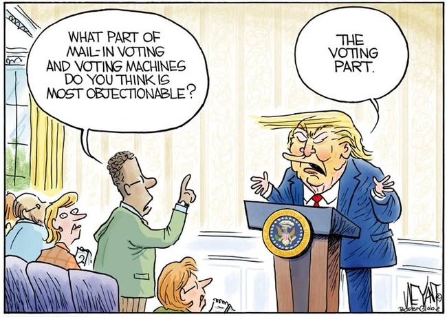 As for Weyant’s cartoon, there’s little joke in that, either. Trump has gone from questioning the integrity of our voting systems to attempting to violently overturn the results to, now, seeking to impede things to keep voting from happening, except in the empty mockery of a dictatorship’s fixed-outcome counterfeit performance.