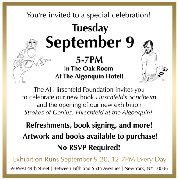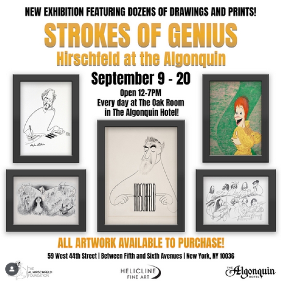 New York, NY – The Al Hirschfeld Foundation will join forces with Helicline Fine Art and The Algonquin Hotel, Autograph Collection (59 W. 44th St, NYC) for a new exhibition of artwork by the legendary artist Al Hirschfeld. “Strokes of Genius: Hirschfeld at the Algonquin” will be on exhibition in the hotel’s legendary Oak Room, September 9 – 20, daily from noon – 7PM, featuring original drawings and hand signed limited edition prints from the worlds of the stage, screen, and concert hall. All artwork is available for purchase. The exhibition at The Algonquin marks the first New York City gallery exhibition of Al Hirschfeld’s work in over ten years.