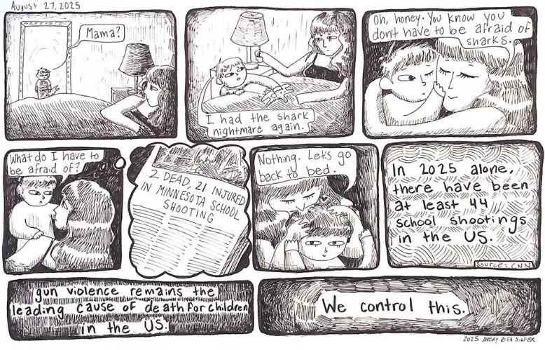 With the start of a new school year comes school newspapers with cartoons and comic strips. I can’t keep track of all the college cartoonists but this one by Avery Rita Silfer for the Daily Lobo struck a nerve.