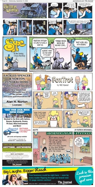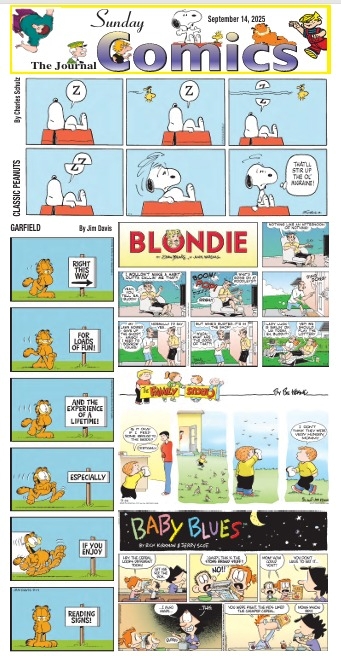 The Martinsburg Journal, a weekly from West Virginia, came up today with Sunday strips for September 14, 2025. About half are King Features comics that are available to subscribers to Comics Kingdom, but the others are Andrews McMeel strips that are seldom available before Saturday night.