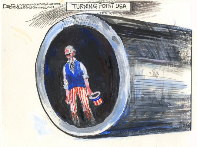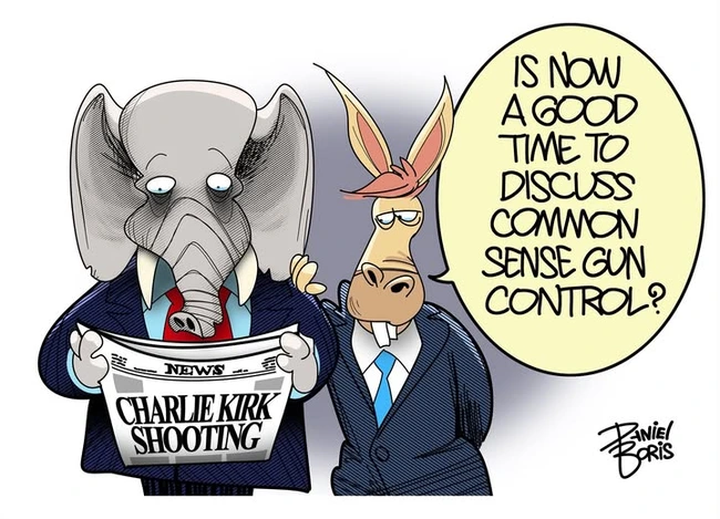 Charlie Kirk was shot yesterday shortly after noon and his death was announced about two hours later, but a look through this morning’s cartoons shows very little response to the event.