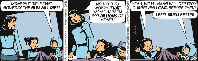 This Brewster Rockit raises a couple of questions, starting with “Where are they?” because I get a sense that if Sol did burn out, they could just go somewhere else, and I kinda wonder if kids living in deep space would even have a sense of one star being more important than another.