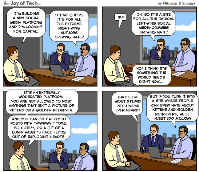 I’m not sure the Intertubes have become quite as cynical and exploitive and heartless as seen in this scenario, but I’m pretty sure the days when venture capitalists were willing to throw money at the wall to see what stuck are at least greatly diminished if not gone entirely.
