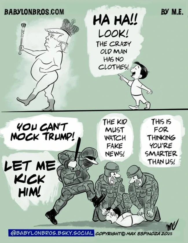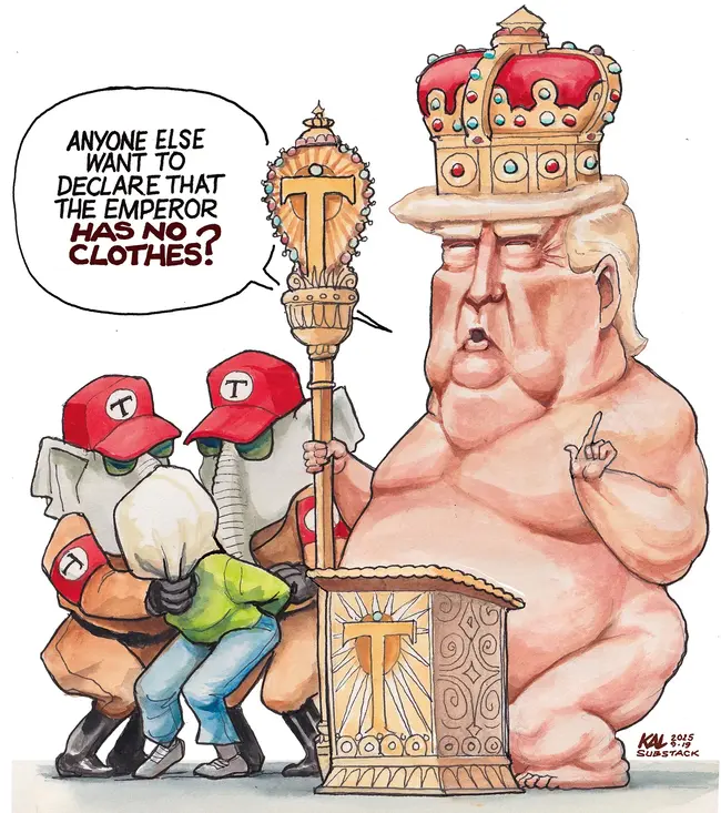 Here are two similar riffs on the tale of the Emperor’s New Clothes, the chief difference being that Kal has the Emperor himself direct the punishment, while Espinoza suggests that loyal followers will act without orders.