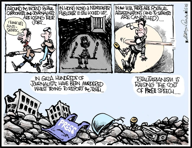 Back in the USA, Bramhall presents a scenario nearly as frightening as Turner’s. Obviously, deliberately killing reporters is both a horror and is classed as a war crime, and it’s hard to underplay the significance of Israel purposely bombing a Yemeni newspaper and killing 31 reporters and other employees.