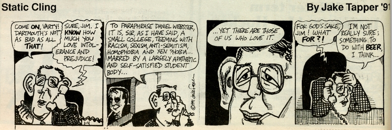 At Dartmouth College Tapper did the Static Cling comic strip for the student paper The Dartmouth.
