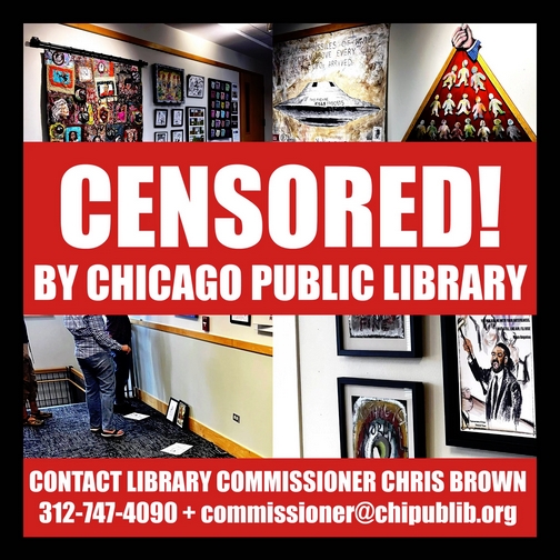 An art exhibit at the Austin-Irving Branch of the Chicago Public Library (on Chicago northwest side) was abruptly removed on September 18th by order of the city’s Library Commissioner following political complaints by two unnamed individuals who are city employees and are on city payroll [emphasis added]. Without contacting the Branch Manager or the show’s curator / organizer, the exhibit was censored and ordered to be taken down early. The show was installed on July 5, 2025, and was scheduled through September 27, 2025.