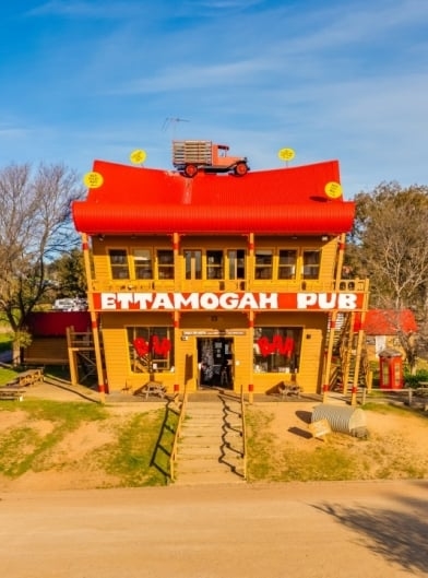 An Albury local, Maynard named the pub in his cartoon after a local water hole he used to cycle to called Ettamogah, an Aboriginal word meaning ‘place of good drink’. The landmark hotel was built and opened in 1987 as a themed family restaurant; it brought Maynard’s vision to life with distinctive architecture modelled on the cartoon. Unique design features include dramatically slanted timber walls, a bull-nosed verandah, and the signature 1927 Chevrolet truck perched on a bright red roof.