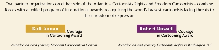 The Robert Russell Courage in Cartooning is a biennial award alternating with the Kofi Annan Courage in Cartooning as sponsored by Cartoonists Rights (Washington, DC) and Freedom Cartoonists (Geneva).