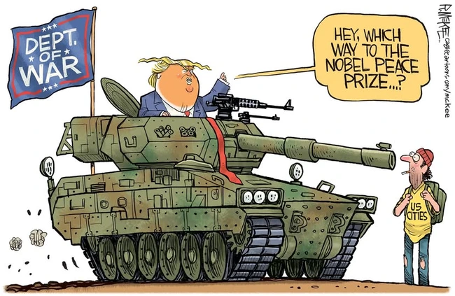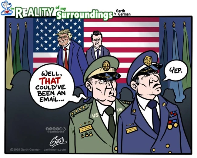 Trump’s portion of the day was, as Wuerker suggests, a blatant attempt to recruit the military for his own political goals, not just in hopes they would vote in his favor but insisting that they allow their troops to be deployed to enforce his personal political goals.