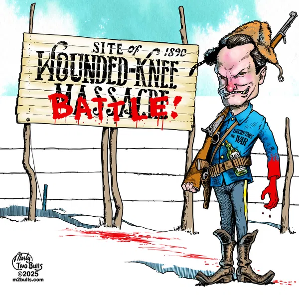 Granted, Two Bulls is Lakota and so has a particular reason to feel that shooting down surrendering Lakota men, women, children and old people is reprehensible, not heroic. However, proclaiming the heroism of their killers is fully in line not only with Hegseth’s speech about the “military ethos” but is also consistent with his record of having intervened to obtain pardons for three men convicted of war crimes in Afghanistan and Iraq.