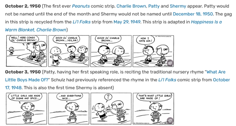 The unparalleled success of “Peanuts,” though, did not include two of the primary characters from the 1950 debut of the strip. One of them, Shermy, delivered the punch line in the first installment on Oct. 2 after bragging up Charlie Brown to Patty, then saying, “Good ol’ Charlie Brown … how I hate him!”