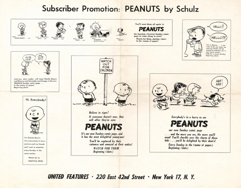 Newspaper promotions for the new Peanuts comic strip offered by United Features Syndicate