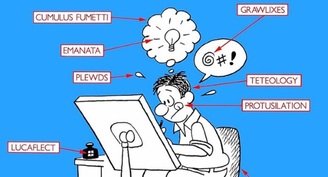 But while he makes some actual, salient points about how comics have their own visual language that have become globally recognized, he humorously undercuts any serious analysis by making up silly, pretentious-sounding terms for ridiculous cartooning conventions.