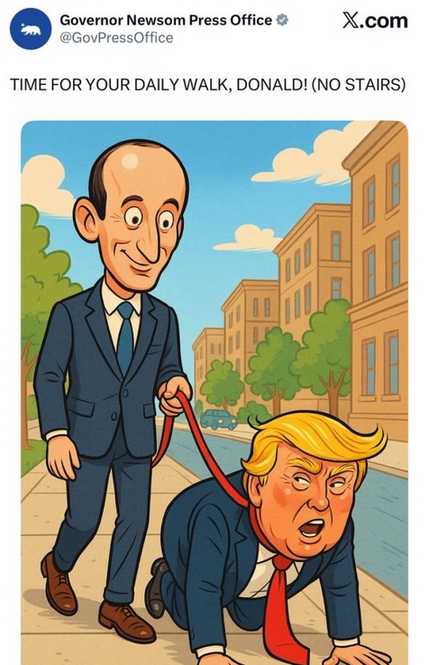 SACRAMENTO — California Governor Gavin Newsom is facing a wave of criticism after the official press account for the governor posted an AI-generated cartoon showing White House deputy chief of staff Stephen Miller leading former President Donald Trump on a leash.
