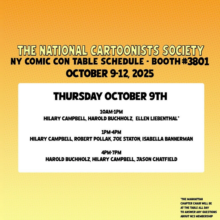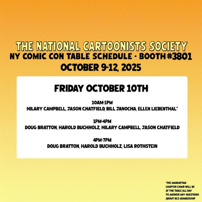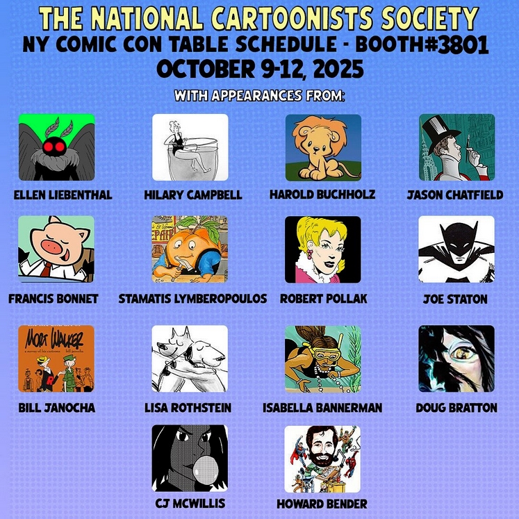 The National Cartoonists Society will also be there with members showing up throughout the run.