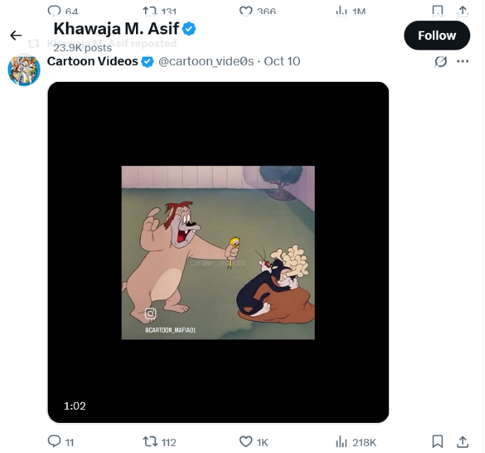 The reposted video, originally shared by the account Cartoon Videos, featured a scene from the classic Tom and Jerry series. The post drew attention when a defence analysis account, Clash Report, highlighted the timing of the minister’s activity, noting, “Meanwhile Pakistan’s defence minister shares a cartoon video on his account while Pakistani forces clash with Taliban.”