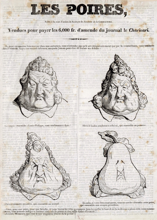 In La Caricature, by the way, one of the most famous sequences in the history of political caricature took place. This was a magazine launched in Paris in 1830, anti-monarchist, where, as we have said, artists of the stature of Daumier collaborated. In it the institutional power was spoliated. The king, Louis-Philippe I, was the constant target of his mockery, which often brought Philipon to court. One day, in the middle of an audience, and knowing that he had lost, he didactically used his drawings to illustrate that the king was easily caricatured and that caricaturists were not to blame, then Philipon, in full view of everyone, transformed the king into a pear (it is worth mentioning that poire, pear, in French colloquially means “fool,” so the metaphor went beyond the mere drawing).