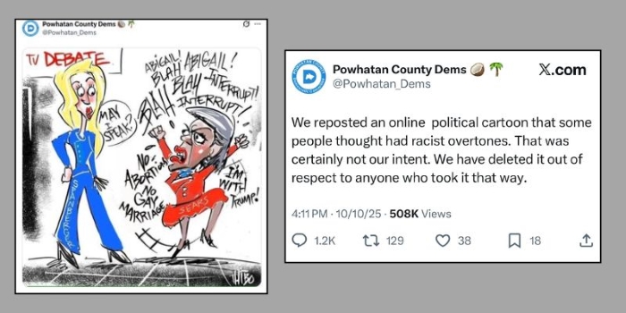 After backlash and reaction to the cartoon, the Powhatan Democrats deleted the post, then issued an apology on X, saying, “We reposted an online political cartoon that some people thought had racist overtones. That was certainly not our intent. We have deleted it out of respect to anyone who took it that way.”